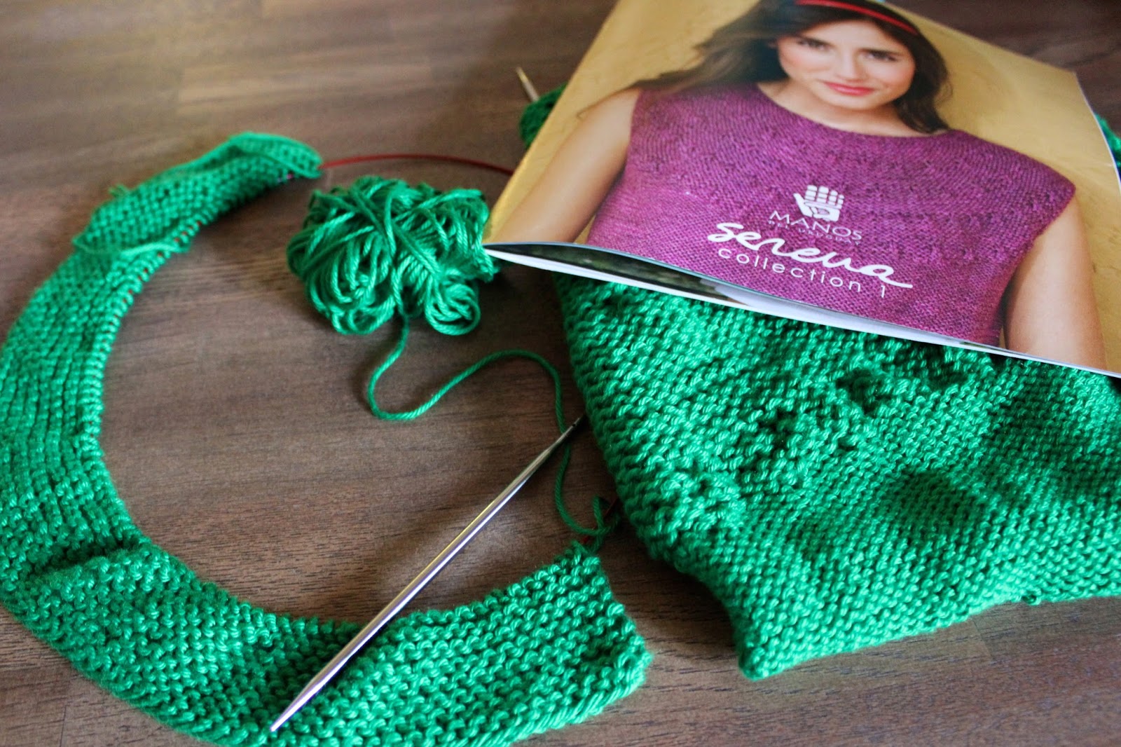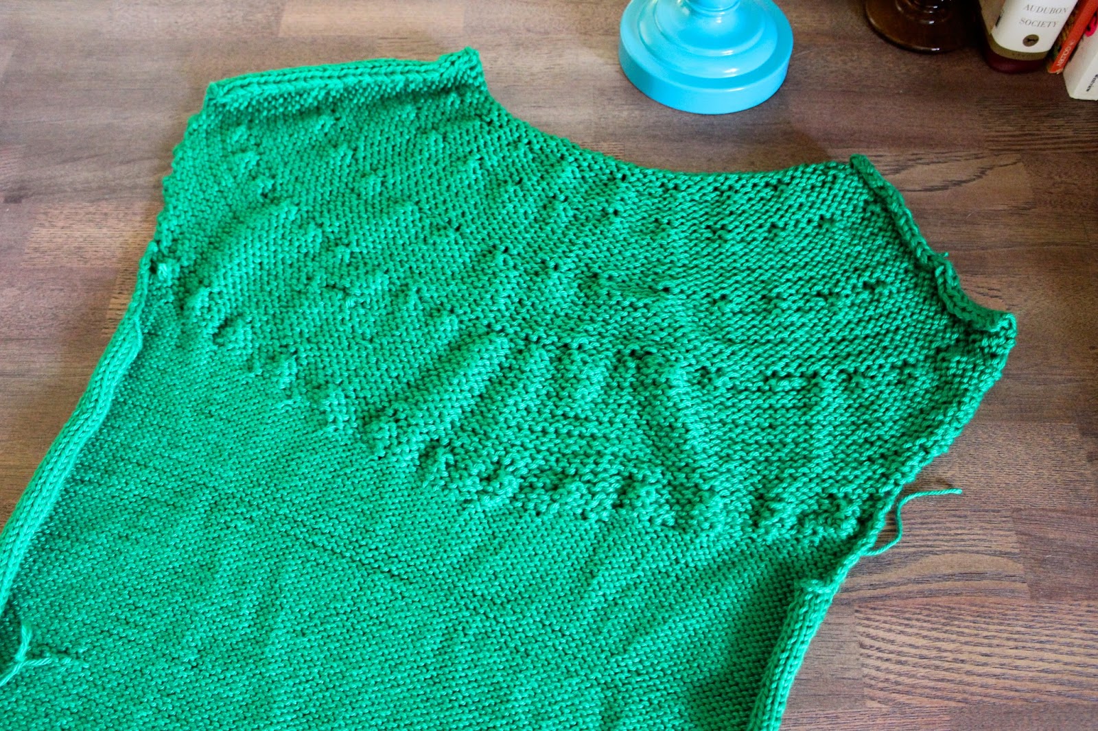 The pattern calls for Manos Del Uruguay Serena yarn, which has quite a bit of alpaca in it. Since I wanted to make a summer top out of this, I went with a strictly plant fiber yarn for my project since me in alpaca garments and Oklahoma's summers don't really get along. The humidity here is insulation enough without adding the magical warmth of alpaca (soft and enticing though it may be). As an alternative, I used Knit Picks Shine Sport in Macaw. My smaller gauge didn't end up causing any problems, and the top still fits comfortably loose despite the difference.
