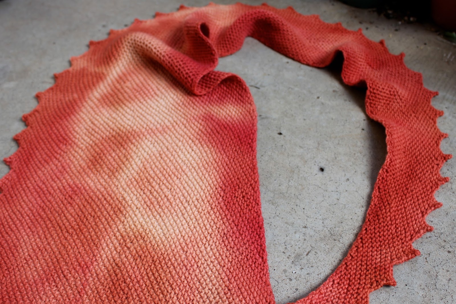 It's been about a month now since I started my mason jar of madder, alum and a Hitch Hiker scarf knitted in bare yarn.  This weekend, I decided that I could not wait any longer and liberated my scarf into the kitchen sink where I rinsed and rinsed until I could roll out the excess, clear running water and hang it up to dry.
